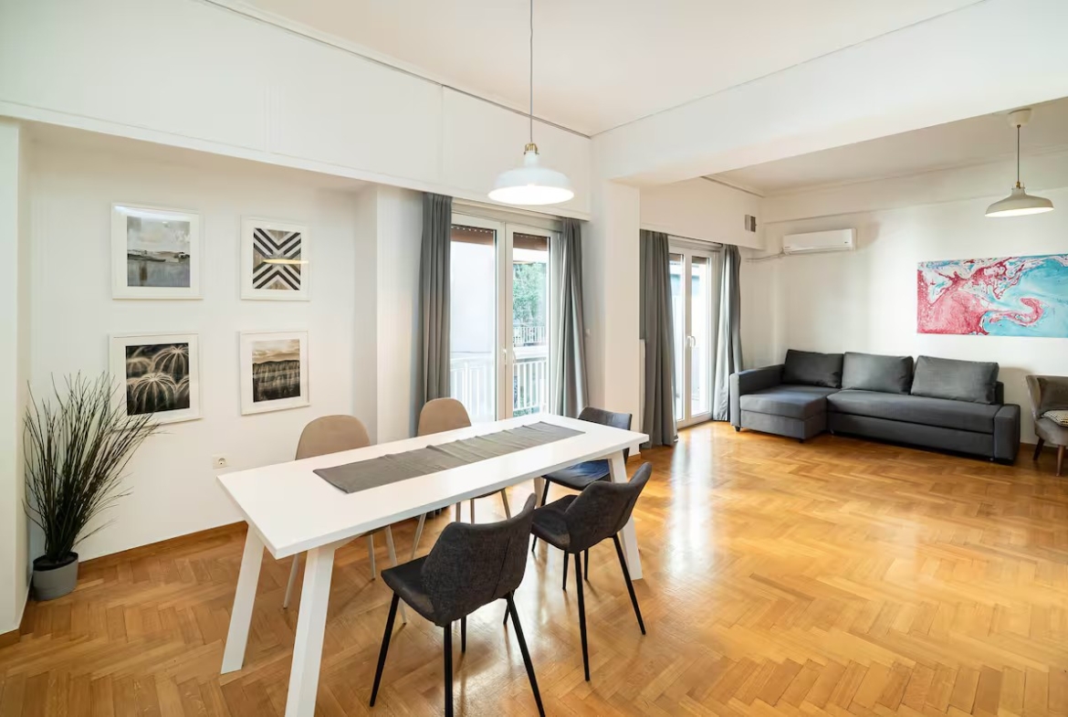This quiet yet central apartment is located on the charming Jean Moreas Street, just a 10-minute walk from the Acropolis, and can comfortably accommodate up to 8 guests. It features 2 cozy bedrooms, 2 double sofa beds in the living room, and 2 modern bathrooms. The spacious kitchen and dining area are perfect for meals and gatherings. Enjoy the tranquility of the neighborhood while being just steps away from Athens’ top attractions, shops, and restaurants.